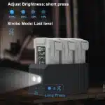 - 🔆【𝗟𝗘𝗗 𝗟𝗶𝗴𝗵𝘁𝘀 𝗠𝗼𝗱𝗲𝗻】Kurzes und langes Drücken: Beleuchtungsfunktion aktivieren; Dann mit jedem kurzen Drücken: Helligkeit anpassen; Helligkeitsstufen: insgesamt fünf (10 % – 100 %); Die letzte Stufe: Stroboskopmodus.