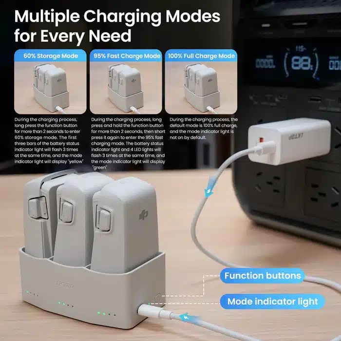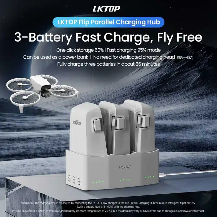 【3 Lademodi】 Das Ladegerät unterstützt das gleichzeitige Laden von drei Akkus. Das Laden von drei DJI Flip-Akkus im 95%-Schnelllademodus dauert nur 77 Minuten und das Laden von drei DJI Flip-Akkus im 100%-Wally-Modus 86 Minuten.